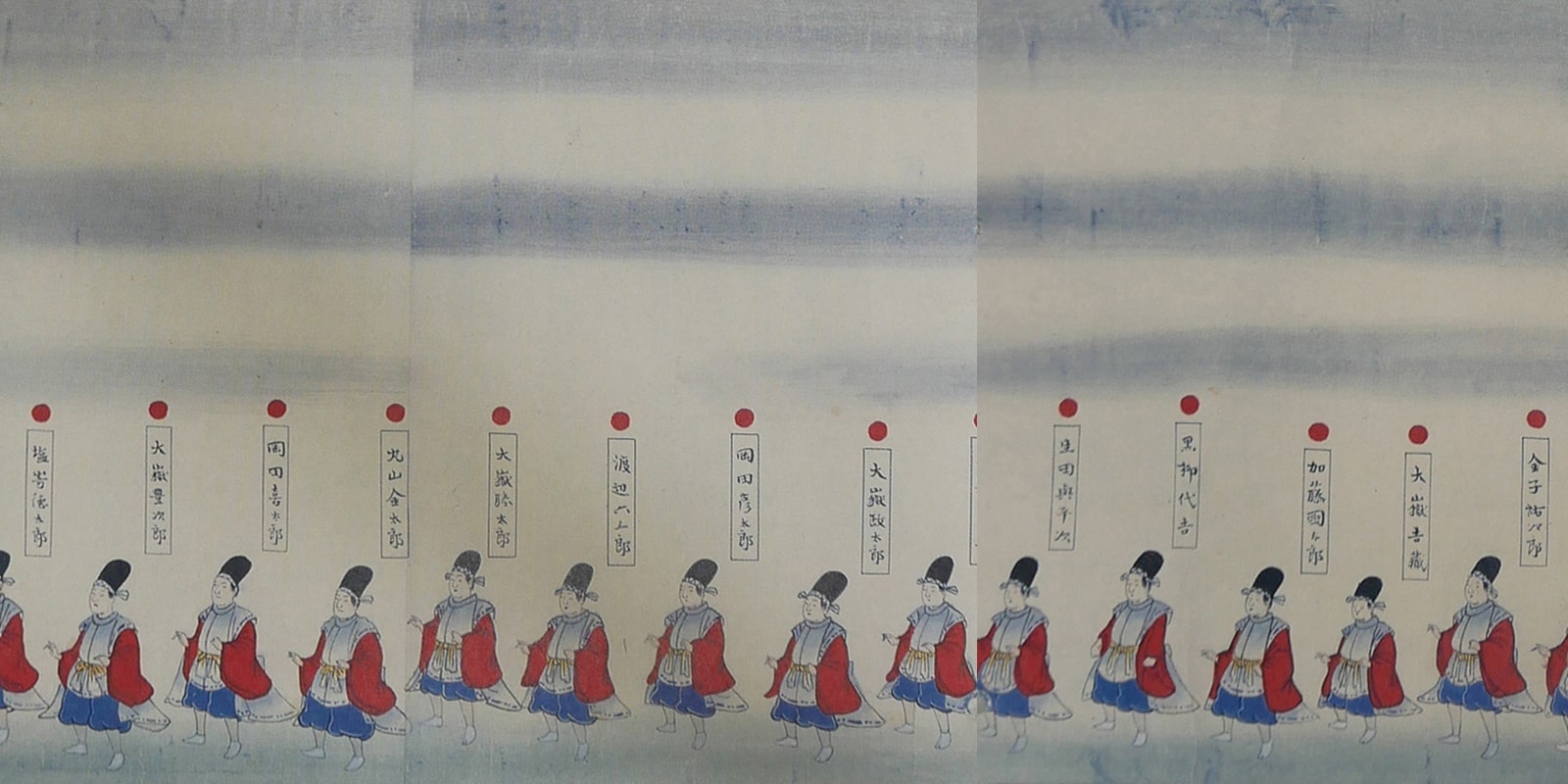 この絵巻物三巻の長さは、第一巻 11.35mm、第二巻 13.27m、第三巻 14.98m、全巻合わせると39.6mの大作です。(幅32.5cm)